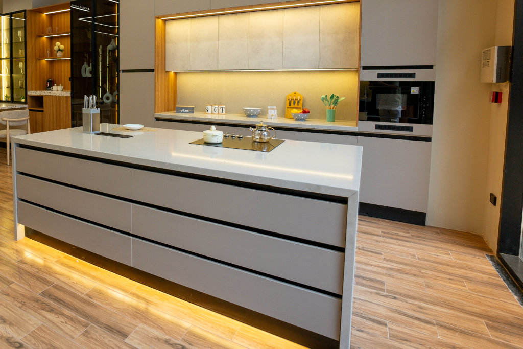 Description: Step into the dramatic world of The Graphite Line kitchen, the ultimate expression of industrial minimalist design. This stunning space features extensive handleless cabinetry in a sophisticated matte charcoal or dark Gray finish, creating a seamless, monochromatic envelope. The design is architecturally defined by integrated LED strip lighting that runs continuously along the toe-kick, under the upper cabinets, and along the ceiling cornice, casting a warm, luminous glow that perfectly contrasts the dark surfaces.